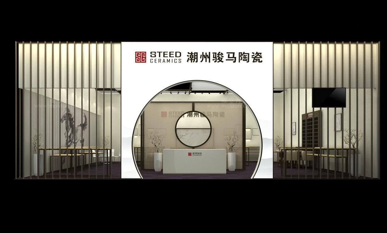 契合駿馬陶瓷的品牌形象和產品特性,采用矩形結構,再搭配燈具燈光的效果,襯托出展位大氣、豪華的氛圍,突出一種簡約、時尚的品味。