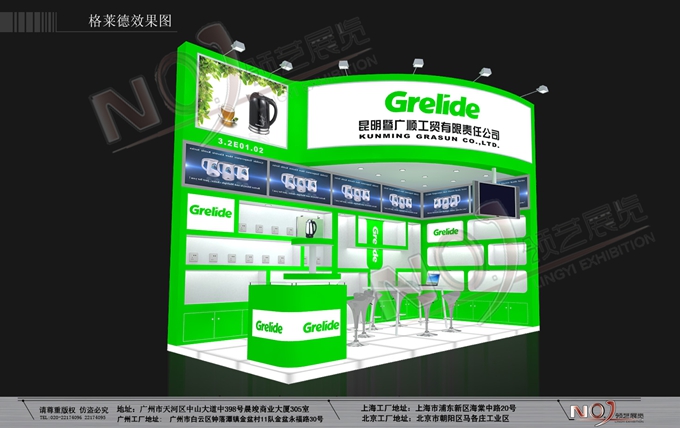 契合格來德的品牌形象和產(chǎn)品特性,采用框型結(jié)構(gòu),再搭配燈具燈光的效果,襯托出展位自由、簡約的氛圍,突出一種現(xiàn)代、舒適的時尚品味。