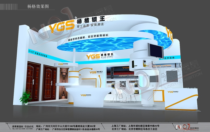 契合楊格鎖業(yè)的品牌形象和產(chǎn)品特性,采用弧形、框架結(jié)構(gòu),再搭配燈具燈光的效果,襯托出展位自由、抽象的氛圍,突出一種簡約、典雅的時(shí)尚品味。