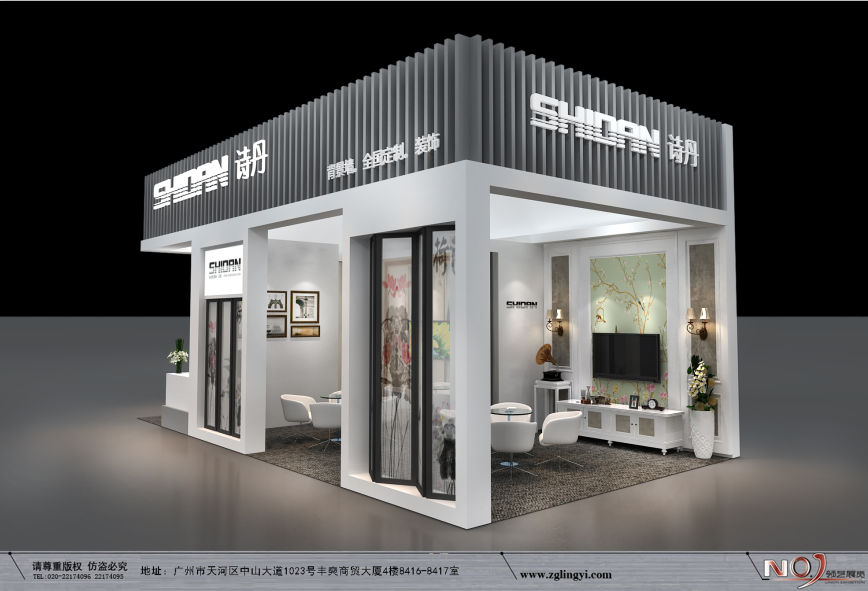 契合詩丹背景墻的品牌形象和產(chǎn)品特性,采用線條、結(jié)構(gòu),再搭配燈具燈光的效果,襯托出展位簡約、時(shí)尚的氛圍,突出一種現(xiàn)代、簡約的時(shí)尚品味。