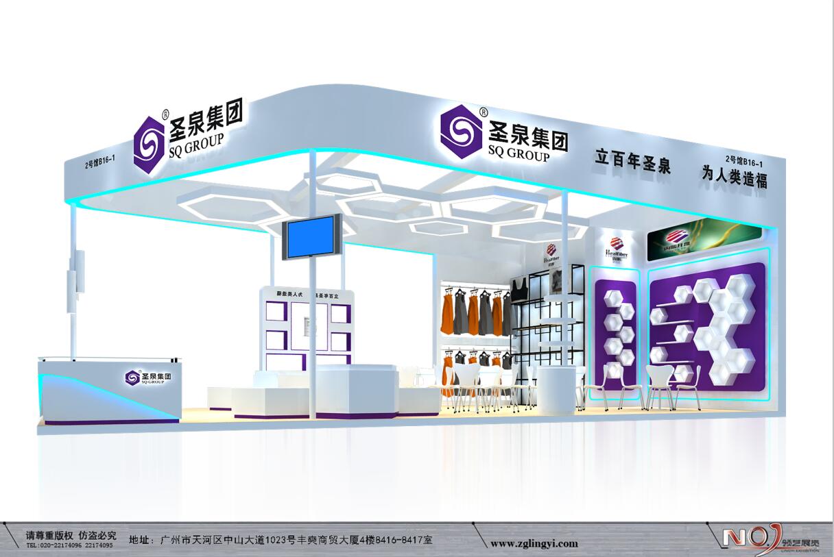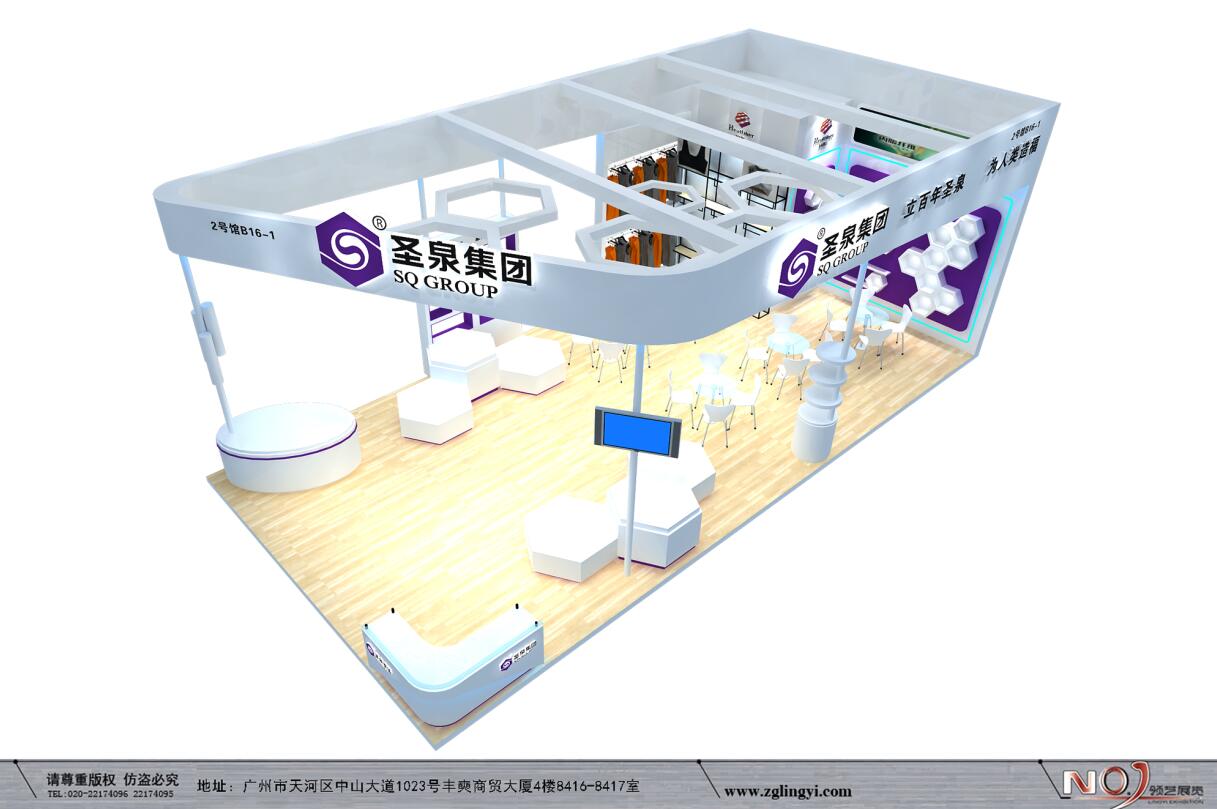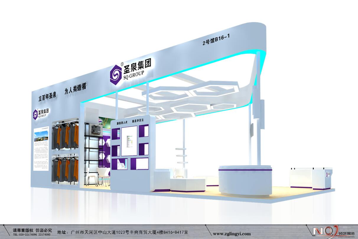 契合山東圣泉品牌形象和產品特性,利用天花造型,再搭配燈具燈光的效果,襯托出展位現代、突出一種現代、高端的時尚品味。