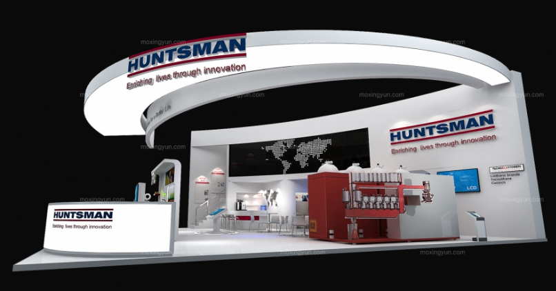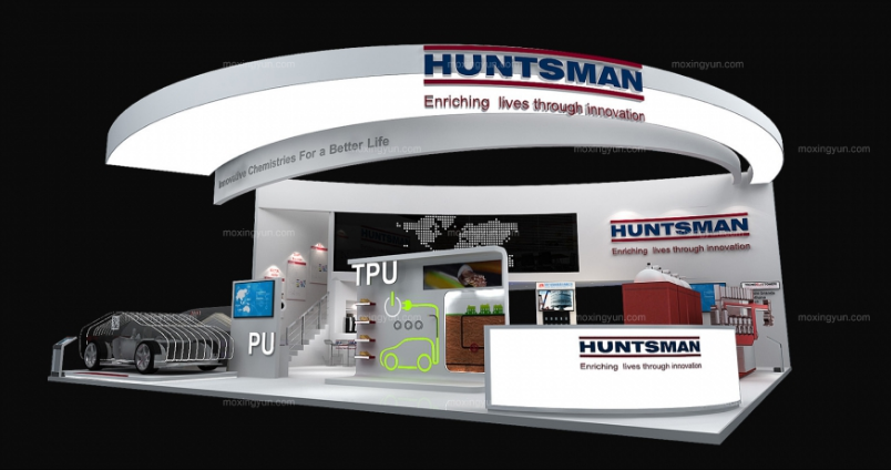 契合亨斯邁的品牌形象和產(chǎn)品特性,采用曲線、框型結(jié)構(gòu),再搭配燈具燈光的效果,襯托出展位簡約、融合的氛圍,突出一種高端、舒適的時尚品味。
