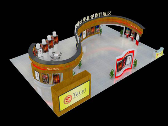 陜西展位外形設(shè)計為一幅畫卷,打開畫卷正面是LED大屏,循環(huán)播放陜西近年來創(chuàng)作的舞臺優(yōu)秀劇目和籌辦第十一屆中國藝術(shù)節(jié)期間陜西舉辦的各類大活動。畫卷的背面是四排立柱,代表了陜西以周、秦、漢、唐為代表的悠久歷史。立柱上頂四方代表關(guān)中平原,兩側(cè)曲面代表陜南、陜北。展位后面是黃河波浪的造型,后浪推前浪代表著三秦兒女自強不息、奮發(fā)向上、勇于拼搏的精神。