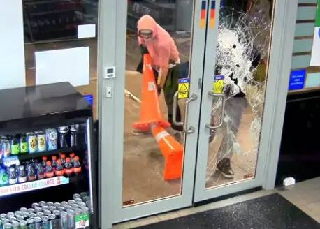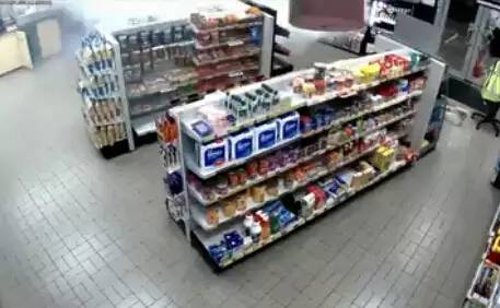 監(jiān)控錄像記錄了事發(fā)的整個(gè)過程:一開始,兩個(gè)帶著作案工具的蒙面盜賊在用力敲擊加油站內(nèi)商店的玻璃門,動(dòng)作十分兇狠。就在他們將要從被砸破的門洞中鉆進(jìn)室內(nèi)時(shí),商店的一角開始噴發(fā)白色煙霧(仔細(xì)看下圖左上角)。