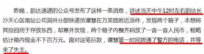 2月18日中午,長沙市洞井安置小區(qū)韻達(dá)快遞的員工譚慧在雨花區(qū)萬芙路長安郡小區(qū)二期門前馬路邊撿到一疊現(xiàn)金,給同在一個公司上班的堂哥譚某勝打電話開玩笑說撿到兩箱錢,估計有幾百萬。堂哥讓譚慧報警,但譚慧并沒有報警,也未告知真相,而是原地等待失主十分鐘左右后離開,去往洞井一小區(qū)與譚某勝匯合,并拿出撿到錢說是失主給的感謝費。經(jīng)清點,發(fā)現(xiàn)有1000元錢。當(dāng)日下午,公司負(fù)責(zé)人之一陳某找其核實情況,并要求他問清處警的民警姓名,于是譚慧撥打110,但未說話。后來,因為面子因素和擔(dān)心被責(zé)怪一直沒說出實情,還編造出撿到四、五百萬并報警,有疑似特警人員處警辦理此事,并以此答復(fù)媒體。