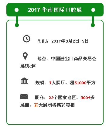 2017年3月2日-2017年3月5日,在中國進(jìn)出口商品交易會(huì)展館,即將舉辦第二十二屆華南國際口腔展覽會(huì),屆時(shí)的廣州口腔展展會(huì)設(shè)計(jì)裝修將展現(xiàn)人們對(duì)口腔的重視,為期4天的展會(huì)將迎來全球100多個(gè)國家的五萬多名口腔醫(yī)療專業(yè)人士,為各位小伙伴們做指導(dǎo)。