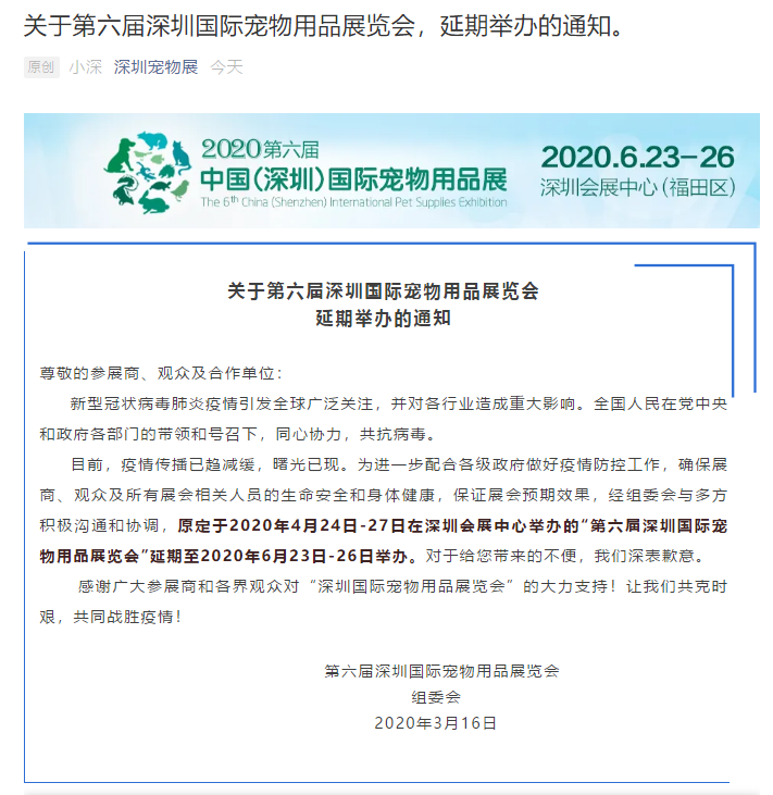 根據(jù)深圳寵物展設計搭建公司領藝展覽了解到,原定于2020年4月24日-27日在深圳會展中心舉辦的“第六屆深圳國際寵物用品展覽會”延期至2020年6月23日-26日舉辦。如需深圳寵物展設計請聯(lián)系領藝展覽,希望我們能在深圳寵物展搭建上為您添磚加瓦,祝各位朋友收獲多多,滿載而歸!
