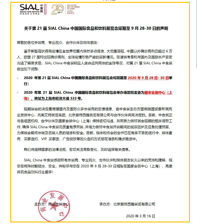 根據(jù)中食展設(shè)計(jì)搭建公司領(lǐng)藝展覽了解到,2020年SIAL China中國國際食品和飲料展覽會(huì)延期至9月28-30日舉行。如需中食展展會(huì)設(shè)計(jì)請聯(lián)系領(lǐng)藝展覽,希望我們能在中食展搭建上為您添磚加瓦,祝各位朋友收獲多多,滿載而歸!