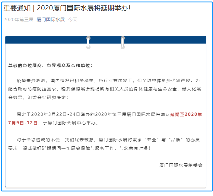 根據(jù)廈門水展設(shè)計(jì)搭建公司領(lǐng)藝展覽了解到,原定于2020年3月22日-24日舉辦的2020年第三屆廈門國際水展將確認(rèn)延期至2020年7月9日-12日,于廈門國際會展中心舉辦。如需廈門水展設(shè)計(jì)請聯(lián)系領(lǐng)藝展覽,希望我們能在廈門水展搭建上為您添磚加瓦,祝各位朋友收獲多多,滿載而歸!