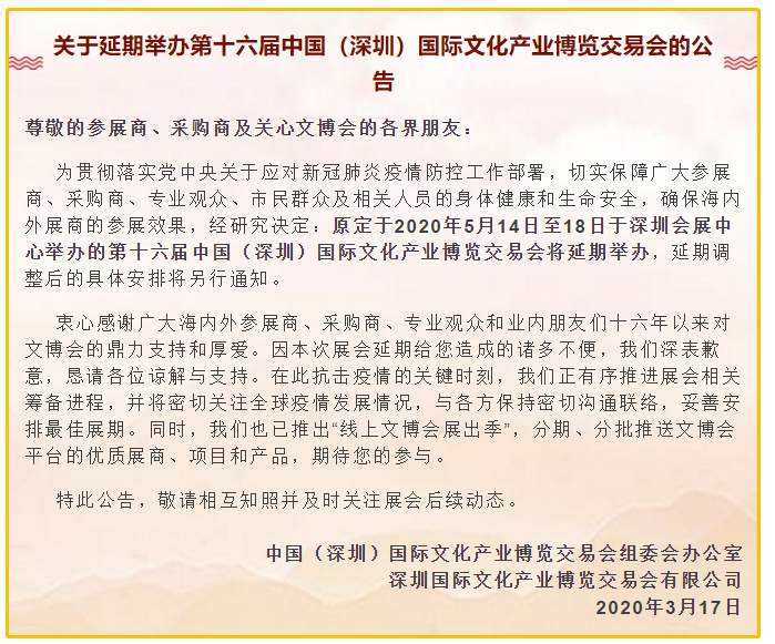 根據(jù)文博會(huì)設(shè)計(jì)搭建公司領(lǐng)藝展覽了解到原定于2020年5月14日至18日于深圳會(huì)展中心舉辦的第十六屆中國(guó)(深圳)國(guó)際文化產(chǎn)業(yè)博覽交易會(huì)將延期舉辦,延期調(diào)整后的具體安排將另行通知。如需文博會(huì)設(shè)計(jì)請(qǐng)聯(lián)系領(lǐng)藝展覽,希望我們能在文博會(huì)搭建上為您添磚加瓦,祝各位朋友收獲多多,滿載而歸!