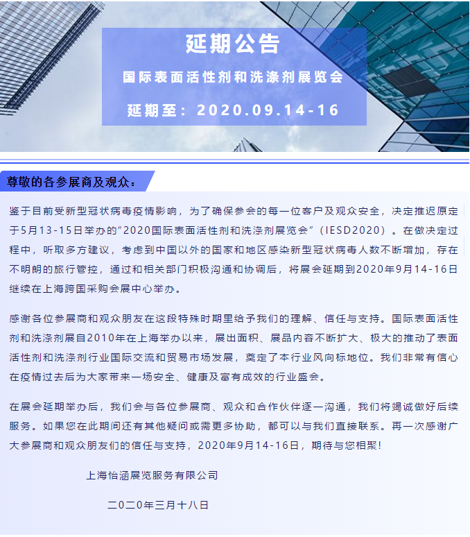 根據(jù)上海展臺設(shè)計搭建公司領(lǐng)藝展覽了解到,鑒于目前受新型冠狀病毒疫情影響,為了確保參會的每一位客戶及觀眾安全,決定推遲原定于5月13-15日舉辦的“2020國際表面活性劑和洗滌劑展覽會”(IESD2020)。將展會延期到2020年9月14-16日繼續(xù)在上??鐕少彆怪行呐e辦。如需上海展會設(shè)計請聯(lián)系領(lǐng)藝展覽,希望我們能在上海展臺搭建上為您添磚加瓦,祝各位朋友收獲多多,滿載而歸!