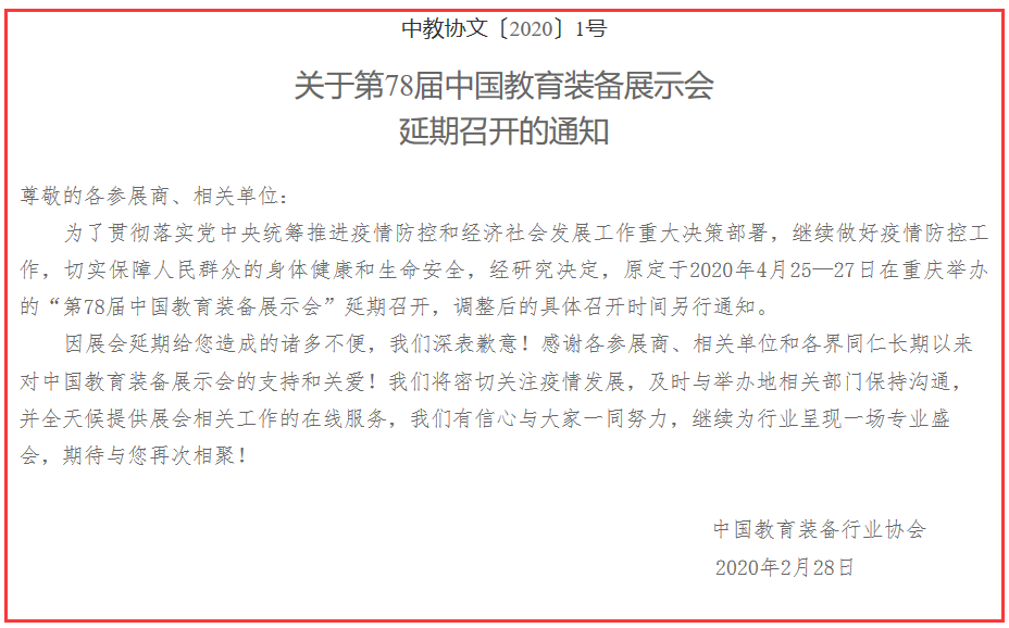 根據(jù)重慶教育展設計搭建公司領藝展覽了解到,為了貫徹落實黨中央統(tǒng)籌推進疫情防控和經(jīng)濟社會發(fā)展工作重大決策部署,繼續(xù)做好疫情防控工作,切實保障人民群眾的身體健康和生命安全,經(jīng)研究決定,原定于2020年4月25—27日在重慶舉辦的“第78屆中國教育裝備展示會”延期召開,調整后的具體召開時間另行通知。如需重慶教育展設計請聯(lián)系領藝展覽,希望我們能在重慶教育展搭建上為您添磚加瓦,祝各位朋友收獲多多,滿載而歸!