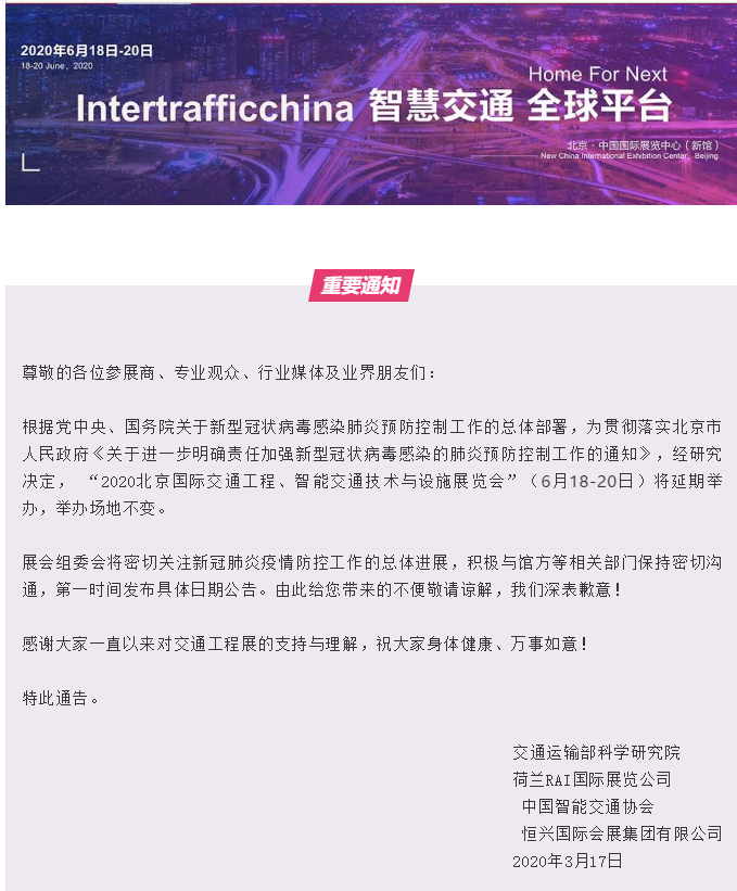 根據(jù)亞洲智能交通展設(shè)計(jì)搭建公司領(lǐng)藝展覽了解到,2020北京國(guó)際交通工程、智能交通技術(shù)與設(shè)施展覽會(huì)”(6月18-20日)將延期舉辦,舉辦場(chǎng)地不變。如需亞洲智能交通展設(shè)計(jì)請(qǐng)聯(lián)系領(lǐng)藝展覽,希望我們能在亞洲智能交通展搭建上為您添磚加瓦,祝各位朋友收獲多多,滿載而歸!