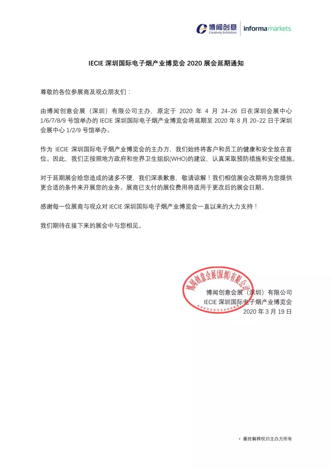 根據(jù)電子煙展設(shè)計(jì)搭建公司領(lǐng)藝展覽了解到,原定于2020年4月24日—26日的2020深圳國際電子煙產(chǎn)業(yè)博覽會(huì)將延期至2020年8月20日—22日舉辦, 展會(huì)地點(diǎn)為深圳會(huì)展中心(福田區(qū))1/2/9號(hào)館。如需電子煙展設(shè)計(jì)請(qǐng)聯(lián)系領(lǐng)藝展覽,希望我們能在電子煙展搭建上為您添磚加瓦,祝各位朋友收獲多多,滿載而歸!