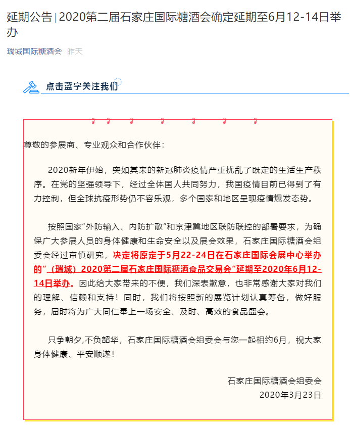 根據(jù)糖酒會設(shè)計搭建公司領(lǐng)藝展覽了解到,原定于5月22-24日在石家莊國際會展中心舉辦的“(瑞城)2020第二屆石家莊國際糖酒食品交易會”延期至2020年6月12-14日舉辦。如需糖酒會設(shè)計請聯(lián)系領(lǐng)藝展覽,希望我們能在糖酒會搭建上為您添磚加瓦,祝各位朋友收獲多多,滿載而歸!