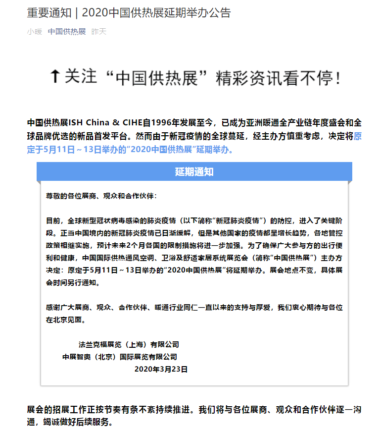根據(jù)供熱展設(shè)計(jì)搭建公司領(lǐng)藝展覽了解到,中國(guó)供熱展ISH China & CIHE自1996年發(fā)展至今,已成為亞洲暖通全產(chǎn)業(yè)鏈年度盛會(huì)和全球品牌優(yōu)選的新品首發(fā)平臺(tái)。然而由于新冠疫情的全球蔓延,經(jīng)主辦方慎重考慮,決定將原定于5月11日~13日舉辦的“2020中國(guó)供熱展”延期舉辦。如需供熱展設(shè)計(jì)請(qǐng)聯(lián)系領(lǐng)藝展覽,希望我們能在供熱展搭建上為您添磚加瓦,祝各位朋友收獲多多,滿載而歸!