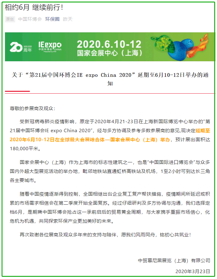 根據(jù)環(huán)博會設計搭建公司領藝展覽了解到,原定于2020年4月21-23日在上海新國際博覽中心舉辦的“第21屆中國環(huán)博會IE expo China 2020”,經(jīng)與多方協(xié)調(diào)及參考多數(shù)參展商的意見,現(xiàn)決定延期至2020年6月10-12日在全球最大會展綜合體—國家會展中心(上海)舉辦,預計展出面積達180,000平米。如需環(huán)博會設計請聯(lián)系領藝展覽,希望我們能在環(huán)博會搭建上為您添磚加瓦,祝各位朋友收獲多多,滿載而歸!