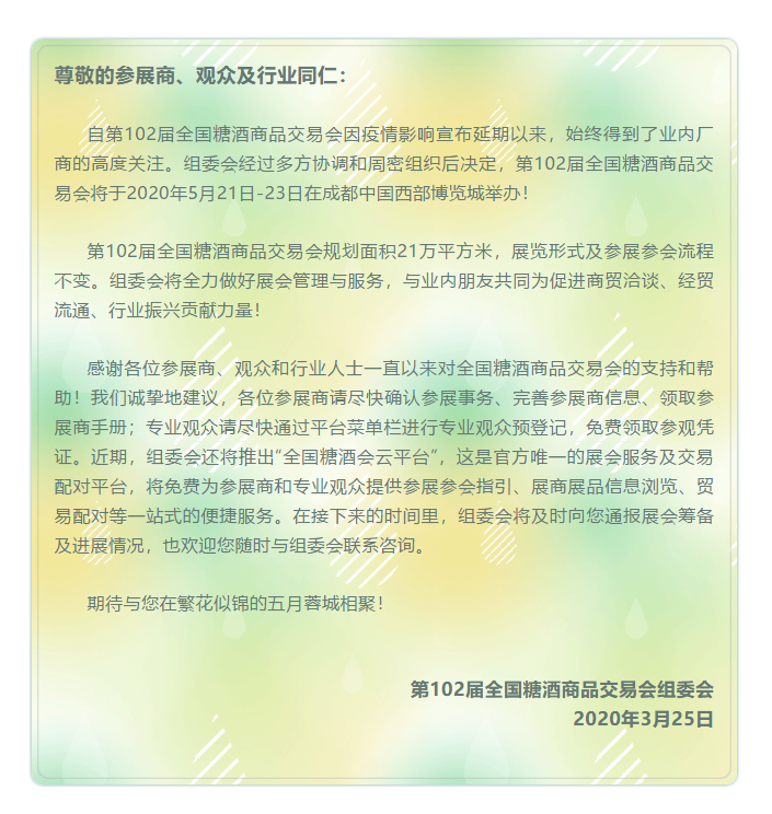 根據(jù)糖酒會設(shè)計搭建公司領(lǐng)藝展覽了解到,受新型冠狀病毒疫情防控影響。為全力做好新型冠狀病毒感染肺炎疫情防控工作,為了響應(yīng)及配合疫情防控工作,確保各參展商及觀眾的健康安全,2020年第102屆全國春季糖酒會將于5月21-24日在成都西部國際博覽城舉行。如需糖酒會設(shè)計請聯(lián)系領(lǐng)藝展覽,希望我們能在糖酒會搭建上為您添磚加瓦,祝各位朋友收獲多多,滿載而歸!