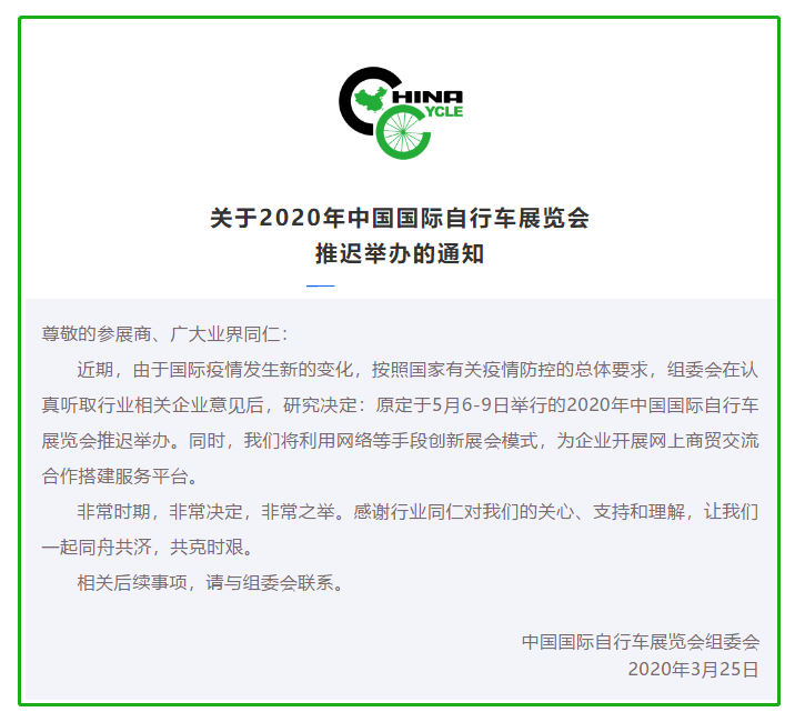 根據(jù)自行車展設(shè)計(jì)搭建公司領(lǐng)藝展覽了解到,原定于5月6-9日舉行的2020年中國國際自行車展覽會(huì)推遲舉辦。同時(shí),主辦方將利用網(wǎng)絡(luò)等手段創(chuàng)新展會(huì)模式,為企業(yè)開展網(wǎng)上商貿(mào)交流合作搭建服務(wù)平臺(tái)。如需自行車展設(shè)計(jì)請聯(lián)系領(lǐng)藝展覽,希望我們能在自行車展搭建上為您添磚加瓦,祝各位朋友收獲多多,滿載而歸!