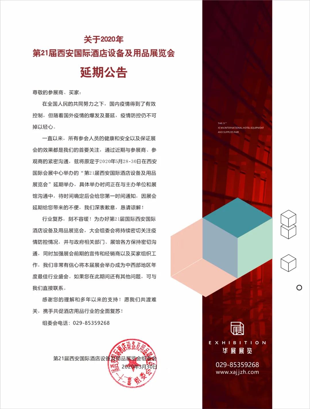 根據(jù)酒店用品展設計搭建公司領藝展覽了解到,2020年西安國際酒店用品展將延期舉辦。如需酒店用品展設計請聯(lián)系領藝展覽,希望我們能在酒店用品展搭建上為您添磚加瓦,祝各位朋友收獲多多,滿載而歸!
