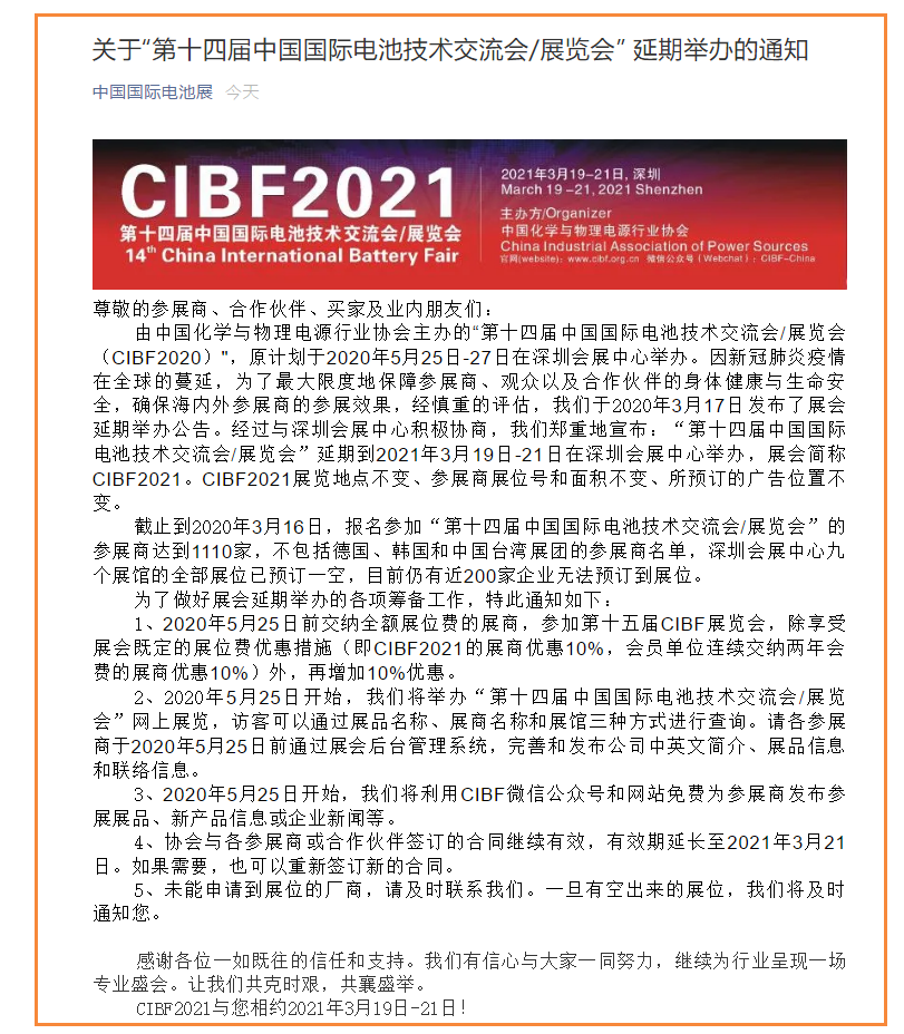 根據(jù)電池展設(shè)計(jì)搭建公司領(lǐng)藝展覽了解到,原計(jì)劃于2020年5月25日-27日在深圳會(huì)展中心舉辦。因新冠肺炎疫情在全球的蔓延,為了最大限度地保障參展商、觀眾以及合作伙伴的身體健康與生命安全,確保海內(nèi)外參展商的參展效果,經(jīng)慎重的評(píng)估,我們于2020年3月17日發(fā)布了展會(huì)延期舉辦公告。經(jīng)過(guò)與深圳會(huì)展中心積極協(xié)商,我們鄭重地宣布:“第十四屆中國(guó)國(guó)際電池技術(shù)交流會(huì)/展覽會(huì)”延期到2021年3月19日-21日在深圳會(huì)展中心舉辦,展會(huì)簡(jiǎn)稱CIBF2021。如需電池展設(shè)計(jì)請(qǐng)聯(lián)系領(lǐng)藝展覽,希望我們能在電池展搭建上為您添磚加瓦,祝各位朋友收獲多多,滿載而歸!