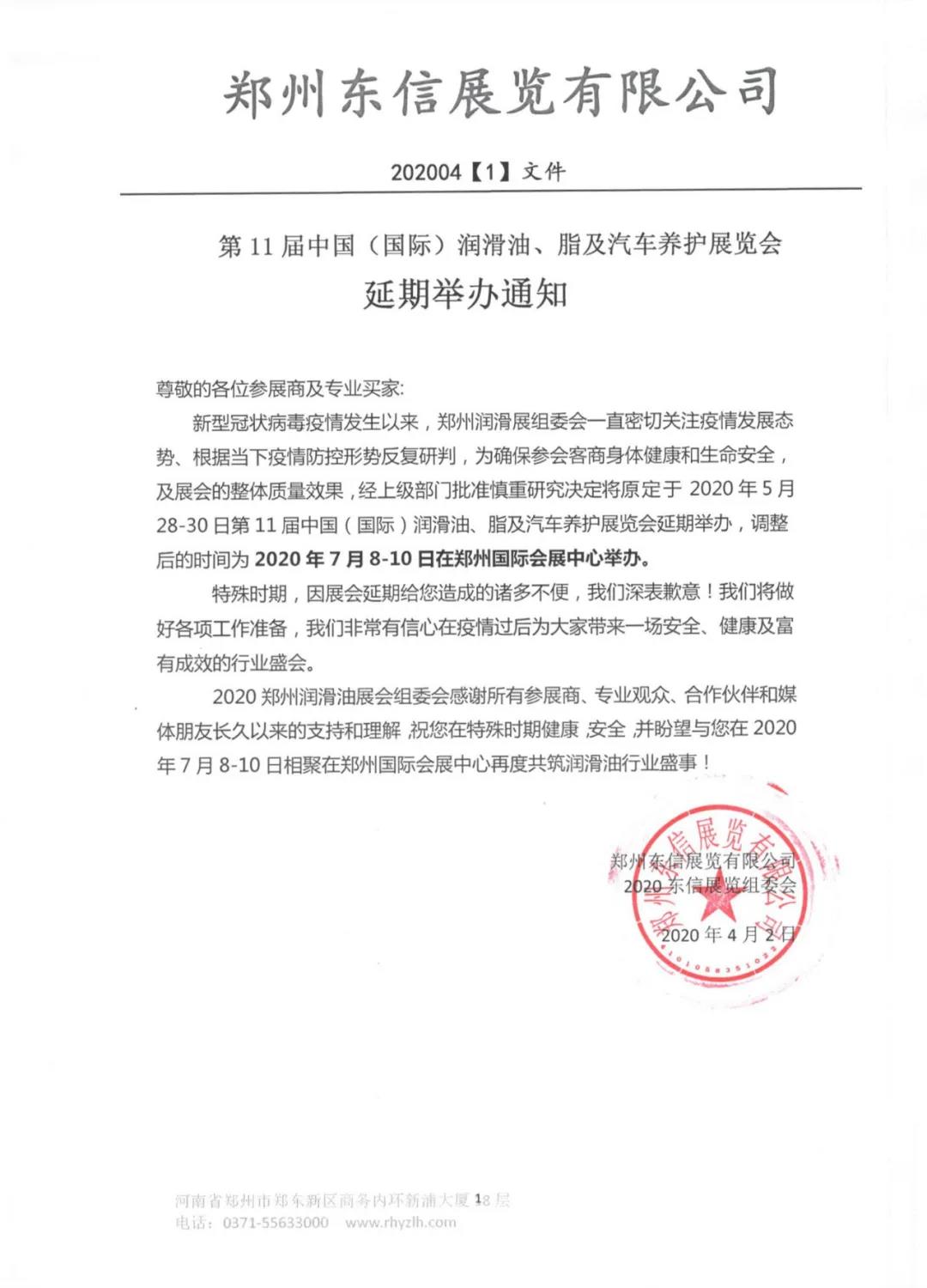 根據(jù)潤(rùn)滑油展設(shè)計(jì)搭建公司領(lǐng)藝展覽了解到,受新冠肺炎疫情影響,原定于2020年5月28-30日舉辦的第11屆中國(guó)潤(rùn)滑油、脂及汽車(chē)養(yǎng)護(hù)展覽會(huì)延期至2020年7月8-10日在鄭州國(guó)際會(huì)展中心舉辦。如需潤(rùn)滑油展設(shè)計(jì)請(qǐng)聯(lián)系領(lǐng)藝展覽,希望我們能在潤(rùn)滑油展搭建上為您添磚加瓦,祝各位朋友收獲多多,滿(mǎn)載而歸!
