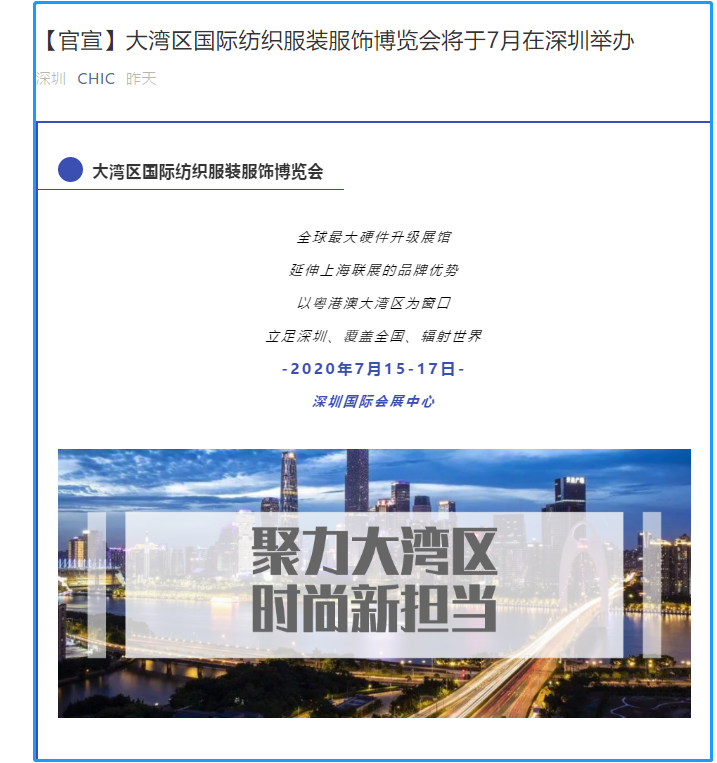 根據(jù)服裝展設(shè)計搭建公司領(lǐng)藝展覽了解到,中國紡織工業(yè)聯(lián)合會應運推出大灣區(qū)國際紡織服裝服飾博覽會(簡稱“大灣區(qū)紡博會”),集結(jié)四大專業(yè)展會——大灣區(qū)國際紡織面料及輔料博覽會、大灣區(qū)國際服裝服飾博覽會、大灣區(qū)國際針織博覽會、大灣區(qū)國際紡織紗線博覽會,將以近12萬平方米的展出規(guī)模,于2020年7月15日~17日亮相深圳國際會展中心。如需服裝展設(shè)計請聯(lián)系領(lǐng)藝展覽,希望我們能在服裝展搭建上為您添磚加瓦,祝各位朋友收獲多多,滿載而歸!