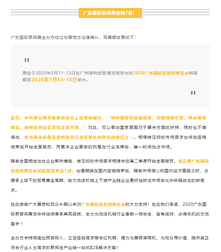 根據(jù)泵閥展設(shè)計(jì)搭建公司領(lǐng)藝展覽了解到,隨著全國(guó)相繼出臺(tái)企業(yè)幫扶措施,被壓抑的市場(chǎng)需求相信會(huì)在第二季度開(kāi)始全面復(fù)蘇。第五屆廣東國(guó)際泵管閥展覽會(huì)將延期至黃金7月,也是期冀在國(guó)內(nèi)疫情結(jié)束后,隨著市場(chǎng)信心和國(guó)內(nèi)經(jīng)濟(jì)重振之時(shí),占據(jù)承上啟下的貿(mào)易黃金周期,助力流體機(jī)械上下游產(chǎn)業(yè)鏈企業(yè)更好地抓住市場(chǎng)變化中所釋放出的新需求。如需泵閥展設(shè)計(jì)請(qǐng)聯(lián)系領(lǐng)藝展覽,希望我們能在泵閥展搭建上為您添磚加瓦,祝各位朋友收獲多多,滿(mǎn)載而歸!