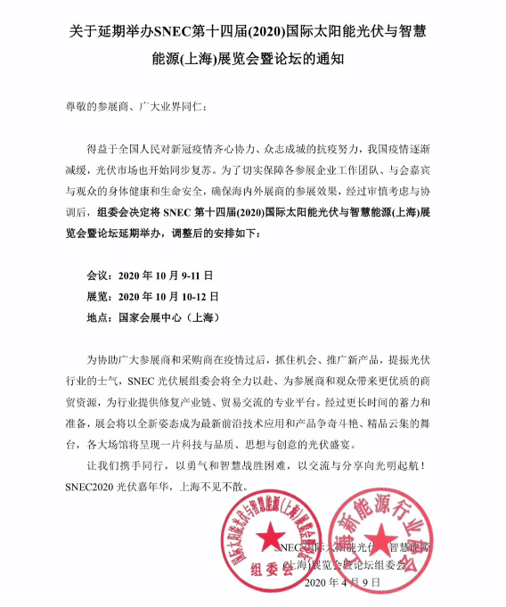 根據(jù)光伏展設計搭建公司領藝展覽了解到,SNEC第十四屆(2020)國際太陽能光伏與智慧能源(上海)展覽會暨論壇延期至2020年10月10-12日舉行。如需光伏展設計請聯(lián)系領藝展覽,希望我們能在光伏展搭建上為您添磚加瓦,祝各位朋友收獲多多,滿載而歸!