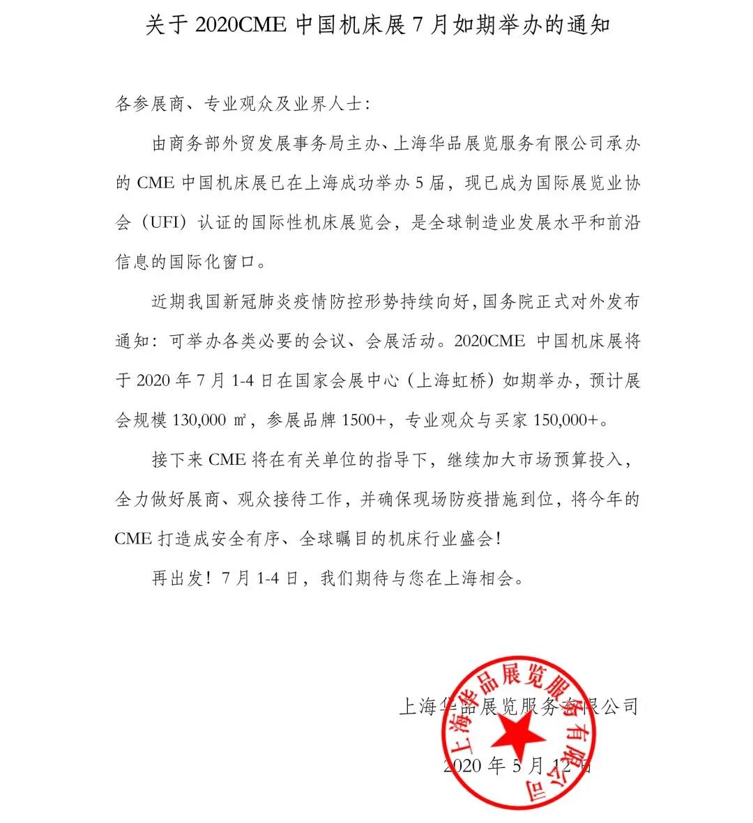 上海機床展設計搭建公司領藝展覽了解到,原定于2020年2月25日舉行的CME中國機床展將延期至2020年7月1-4日舉行。如需上海機床展設計請聯(lián)系領藝展覽,希望我們能在上海機床展搭建上為您添磚加瓦,祝各位朋友收獲多多,滿載而歸!