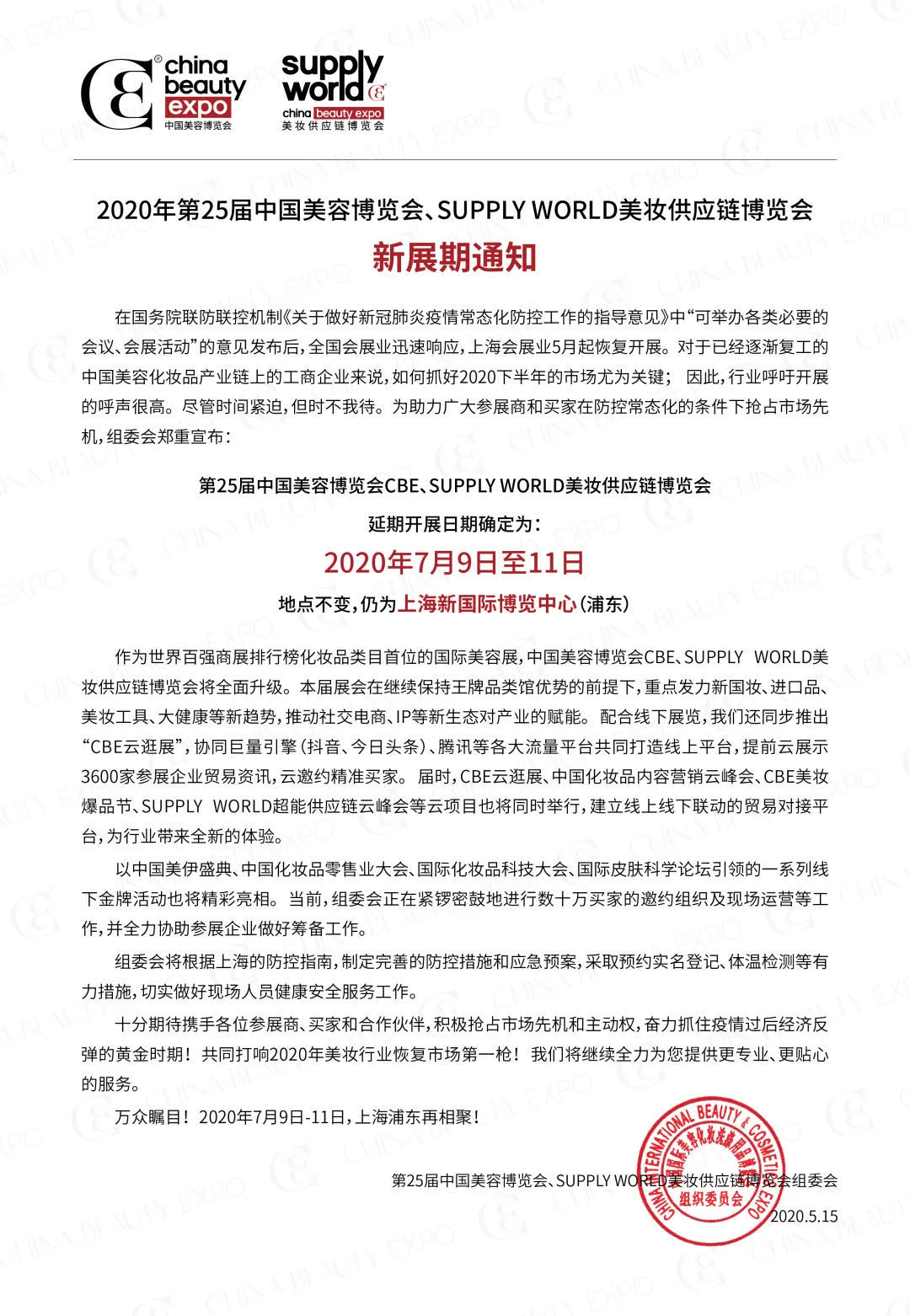 根據(jù)美容博覽會指定設計搭建公司領藝展覽了解到,原定于2020年5月19日至21日在上海新國際博覽中心舉辦的第25屆中國美容博覽會CBE、SUPPLY WORLD美妝供應鏈博覽會及所有同期相關活動,將延期至2020年7月9-11日舉行,舉辦地點不變。如需美容博覽會設計請聯(lián)系領藝展覽,希望我們能在美容博覽會搭建上為您添磚加瓦,祝各位朋友收獲多多,滿載而歸!