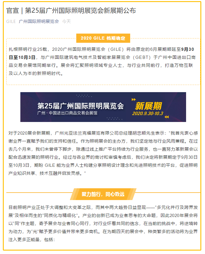廣州照明展設(shè)計搭建公司領(lǐng)藝展覽了解到,扎根照明行業(yè)25載,2020廣州國際照明展覽會(GILE)將由原定的6月展期順延至9月30日至10月3日,與廣州國際建筑電氣技術(shù)及智能家居展覽會(GEBT)于廣州中國進(jìn)出口商品交易會展館同期舉行。展會將匯聚照明領(lǐng)域?qū)I(yè)人士,與行業(yè)共同前行,打造萬物互聯(lián)及以人為本的新照明時代。如需照明展設(shè)計請聯(lián)系領(lǐng)藝展覽,希望我們能在照明展搭建上為您添磚加瓦,祝各位朋友收獲多多,滿載而歸!