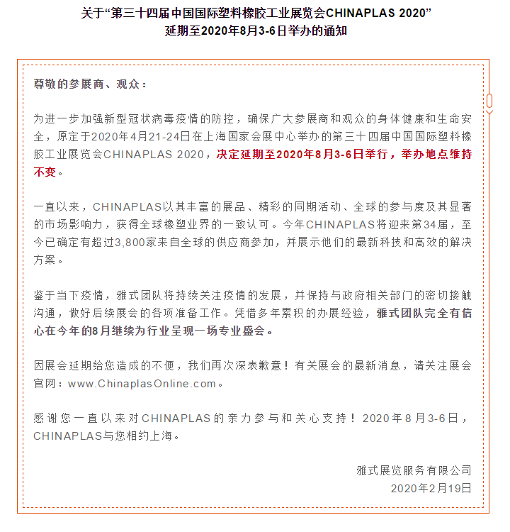 根據橡塑展設計搭建公司領藝展覽解到,為進一步加強新型冠狀病毒疫情的防控,確保廣大參展商和觀眾的身體健康和生命安全,原定于2020年4月21-24日在上海國家會展中心舉辦的第三十四屆中國國際塑料橡膠工業(yè)展覽會CHINAPLAS 2020,決定延期至2020年8月3-6日舉行,舉辦地點維持不變。