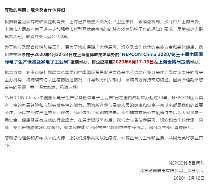 根據(jù)上海電子展設(shè)計(jì)搭建公司領(lǐng)藝展覽解到為了響應(yīng)及配合疫情防控工作,更為了切實(shí)保障廣大參展商、觀眾及合作伙伴的生命安全和身體健康,我們決定將原定于2020年4月22-24日在上海世博展覽館舉辦的“NEPCON China 2020/第三十屆中國國際電子生產(chǎn)設(shè)備暨微電子工業(yè)展”延期舉辦,暫定延期至2020年6月17-19日在上海世博展覽館舉辦。領(lǐng)藝展覽為您上海電子展設(shè)計(jì)搭建保駕護(hù)航。