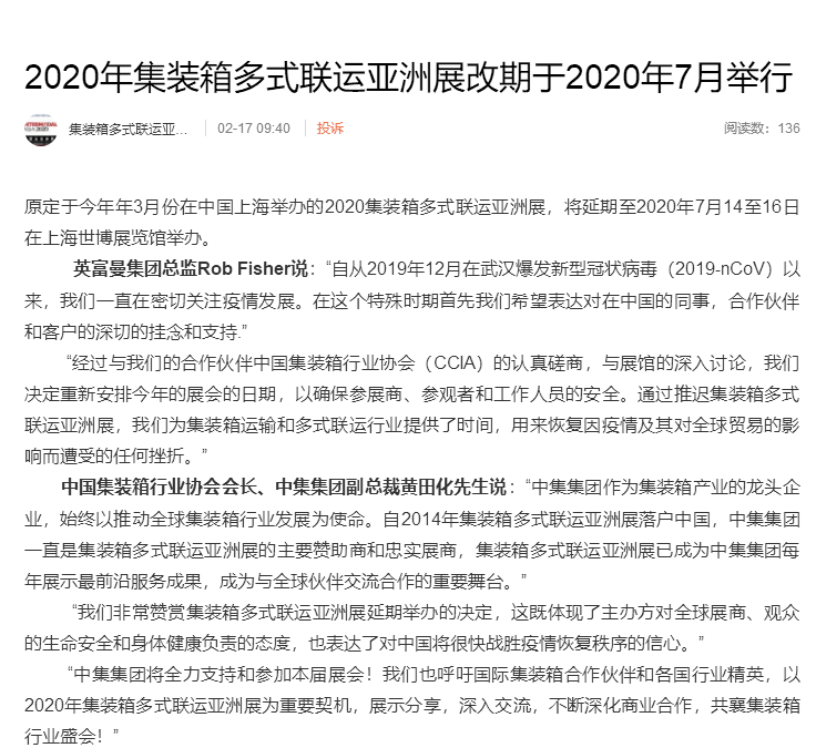 根據(jù)上海集裝箱展設(shè)計(jì)搭建公司領(lǐng)藝展覽解到,原定于今年年3月份在中國(guó)上海舉辦的2020集裝箱多式聯(lián)運(yùn)亞洲展,將延期至2020年7月14至16日在上海世博展覽館舉辦。如需上海集裝箱展設(shè)計(jì)請(qǐng)聯(lián)系領(lǐng)藝展覽,希望我們能在上海集裝箱展搭建上為您添磚加瓦,祝各位朋友收獲多多,滿載而歸!