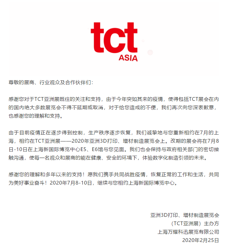 根據(jù)TCT亞洲展——2020年亞洲3D打印、增材制造展覽會(huì)設(shè)計(jì)搭建公司領(lǐng)藝展覽了解到,由于目前疫情正在逐步得到控制,生產(chǎn)秩序逐步恢復(fù),TCT亞洲展——2020年亞洲3D打印、增材制造展覽會(huì)將改期至7月8日-10日在上海新國(guó)際博覽中心E5、E6館與您見面。主辦方也會(huì)保持與政府相關(guān)部門的密切接觸溝通,使每一名觀眾和展商的能在健康、安全的環(huán)境下,體驗(yàn)數(shù)字化制造引領(lǐng)的未來。如需上海3D打印展設(shè)計(jì)請(qǐng)聯(lián)系領(lǐng)藝展覽,希望我們能在TCT亞洲展搭建上為您添磚加瓦,祝各位朋友收獲多多,滿載而歸!