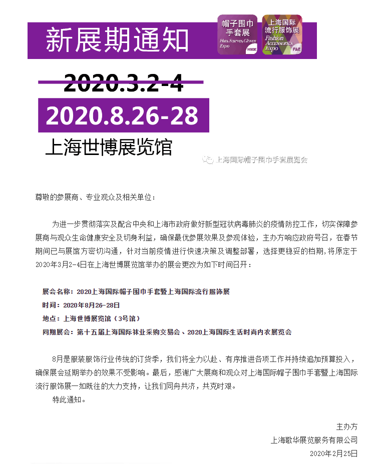 根據(jù)上海國際帽子圍巾手套服裝展設(shè)計(jì)搭建公司領(lǐng)藝展覽了解到,為進(jìn)一步貫徹落實(shí)及配合中央和上海市政府做好新型冠狀病毒肺炎的疫情防控工作,切實(shí)保障參展商與觀眾生命健康安全及切身利益,確保最優(yōu)參展效果及參觀體驗(yàn),主辦方響應(yīng)政府號(hào)召,在春節(jié)期間已與展館方密切溝通,針對當(dāng)前疫情進(jìn)行快速?zèng)Q策及調(diào)整部署,選擇更穩(wěn)妥的檔期,將原定于2020年3月2-4日在上海世博展覽館舉辦的展會(huì)更改2020年8月26-28日召開,如需服飾展設(shè)計(jì)請聯(lián)系領(lǐng)藝展覽,希望我們能在服裝展搭建上為您添磚加瓦,祝各位朋友收獲多多,滿載而歸!