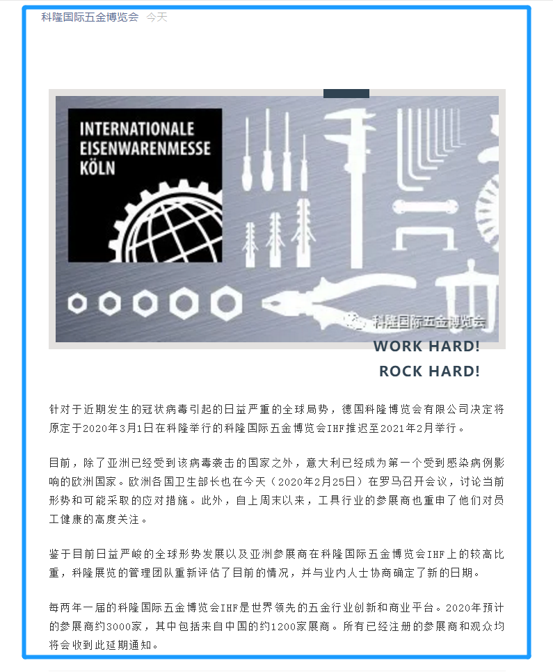 目前,除了亞洲已經(jīng)受到該病毒襲擊的國家之外,意大利已經(jīng)成為第一個受到感染病例影響的歐洲國家。歐洲各國衛(wèi)生部長也在今天(2020年2月25日)在羅馬召開會議,討論當前形勢和可能采取的應對措施。此外,自上周末以來,工具行業(yè)的參展商也重申了他們對員工健康的高度關(guān)注。鑒于目前日益嚴峻的全球形勢發(fā)展以及亞洲參展商在科隆國際五金博覽會IHF上的較高比重,科隆展覽的管理團隊重新評估了目前的情況,并與業(yè)內(nèi)人士協(xié)商確定了新的日期。每兩年一屆的科隆國際五金博覽會IHF是世界領(lǐng)先的五金行業(yè)創(chuàng)新和商業(yè)平臺。2020年預計的參展商約3000家,其中包括來自中國的約1200家展商。所有已經(jīng)注冊的參展商和觀眾均將會收到此延期通知。如需五金展設(shè)計請聯(lián)系領(lǐng)藝展覽,希望我們能在五金展搭建上為您添磚加瓦,祝各位朋友收獲多多,滿載而歸!