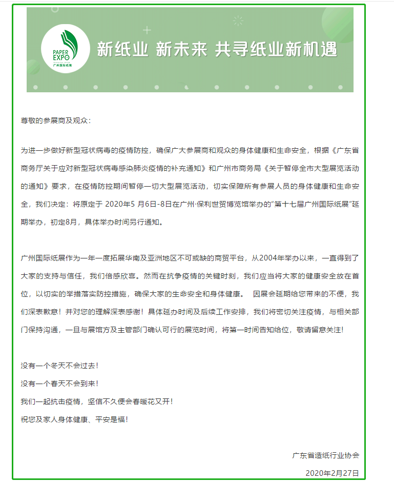 根據紙展設計搭建公司領藝展覽了解到,為進一步做好新型冠狀病毒的疫情防控,確保廣大參展商和觀眾的身體健康和生命安全,根據《廣東省商務廳關于應對新型冠狀病毒感染肺炎疫情的補充通知》和廣州市商務局《關于暫停全市大型展覽活動的通知》要求,在疫情防控期間暫停一切大型展覽活動,切實保障所有參展人員的身體健康和生命安全,主辦決定:將原定于2020年5月6日-8日在廣州·保利世貿博覽館舉辦的“第十七屆廣州國際紙展”延期舉辦,初定8月,具體舉辦時間另行通知。如需紙展設計請聯(lián)系領藝展覽,希望我們能在紙展搭建上為您添磚加瓦,祝各位朋友收獲多多,滿載而歸!