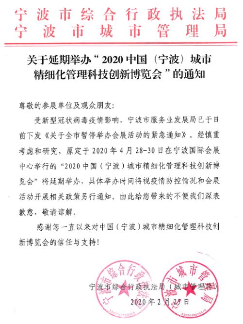 根據(jù)展臺設(shè)計搭建公司領(lǐng)藝展覽了解到,2020中國(寧波)城市精細化管理科技創(chuàng)新博覽會將延期舉辦。如需展臺設(shè)計請聯(lián)系領(lǐng)藝展覽,希望我們能在展位搭建上為您添磚加瓦,祝各位朋友收獲多多,滿載而歸!