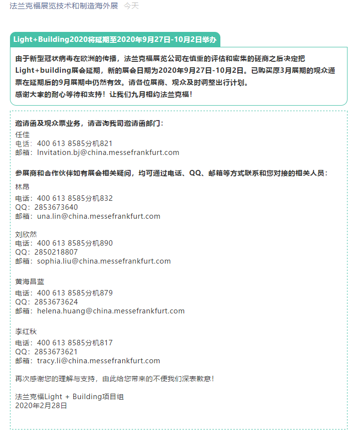 根據(jù)照明展展臺(tái)設(shè)計(jì)公司領(lǐng)藝展覽了解到,由于新型冠狀病毒在歐洲的傳播,法蘭克福展覽公司在慎重的評估和密集的磋商之后決定把Light+building展會(huì)延期,新的展會(huì)日期為2020年9月27日-10月2日。已購買原3月展期的觀眾通票在延期后的9月展期中仍然有效。請各位展商、觀眾及時(shí)調(diào)整出行計(jì)劃。感謝大家的耐心等待和支持!讓我們九月相約法蘭克福!如需照明展展位設(shè)計(jì)裝修請聯(lián)系領(lǐng)藝展覽,希望我們能在照明展布展搭建上為您添磚加瓦,祝各位朋友收獲多多,滿載而歸!