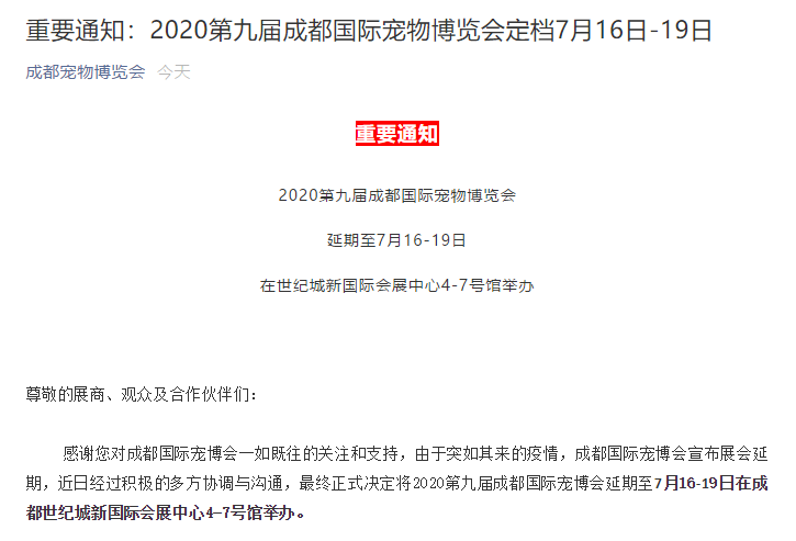 根據(jù)成都寵物展設計搭建公司領藝展覽了解到,由于突如其來的疫情,成都國際寵博會宣布展會延期,近日經(jīng)過積極的多方協(xié)調與溝通,最終正式?jīng)Q定將2020第九屆成都國際寵博會延期至7月16-19日在成都世紀城新國際會展中心4-7號館舉辦。如需成都寵物展設計請聯(lián)系領藝展覽,希望我們能在成都寵物展搭建上為您添磚加瓦,祝各位朋友收獲多多,滿載而歸!