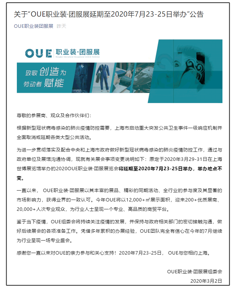 根據(jù)上海服裝展設(shè)計搭建公司領(lǐng)藝展覽了解到,為進(jìn)一步貫徹落實(shí)及配合中央和上海市政府做好新型冠狀病毒感染的肺炎疫情防控工作,通過與政府單位及展館溝通協(xié)調(diào),現(xiàn)就有關(guān)展會事項(xiàng)變更說明如下:原定于2020年3月29-31日在上海世博展覽館舉辦的2020OUE職業(yè)裝·團(tuán)服展覽會將延期至2020年7月23-25日舉辦,舉辦地點(diǎn)不變。如需上海服裝展設(shè)計請聯(lián)系領(lǐng)藝展覽,希望我們能在上海展臺搭建上為您添磚加瓦,祝各位朋友收獲多多,滿載而歸!