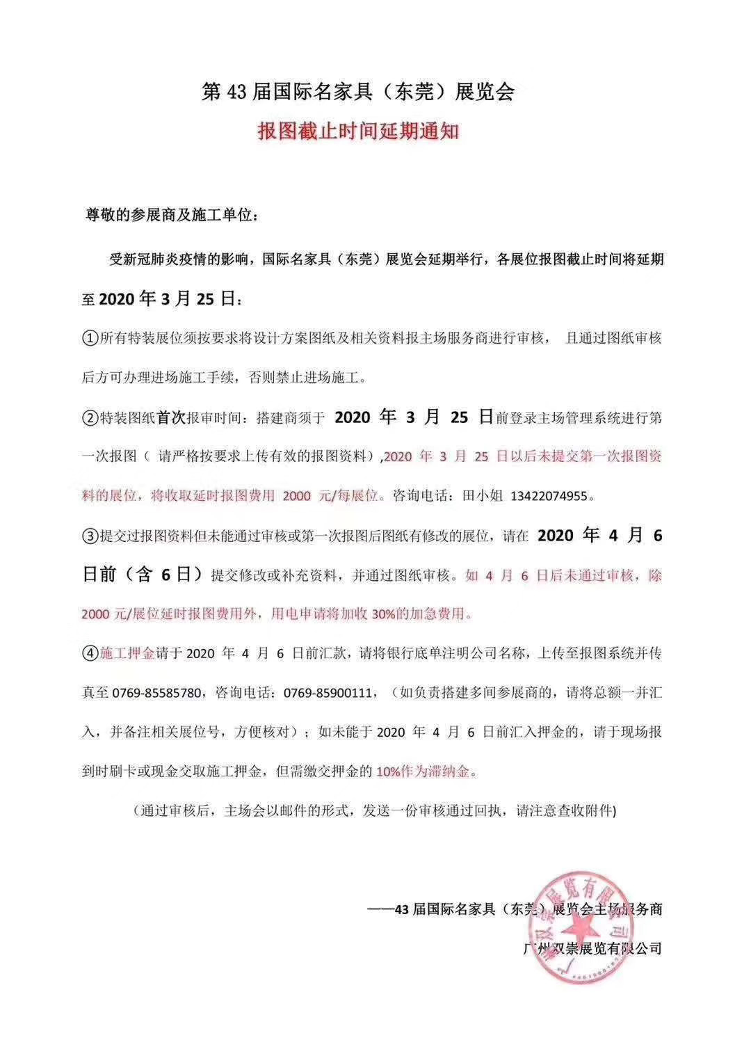 根據(jù)東莞名家具展設(shè)計搭建公司領(lǐng)藝展覽了解到,受新冠肺炎疫情的影響。國際名家具展(延期)舉行,各展位截止報圖時間將延期至2020年3月25日。如需名家具展設(shè)計請聯(lián)系領(lǐng)藝展覽,希望我們能在名家具展搭建上為您添磚加瓦,祝各位朋友收獲多多,滿載而歸!