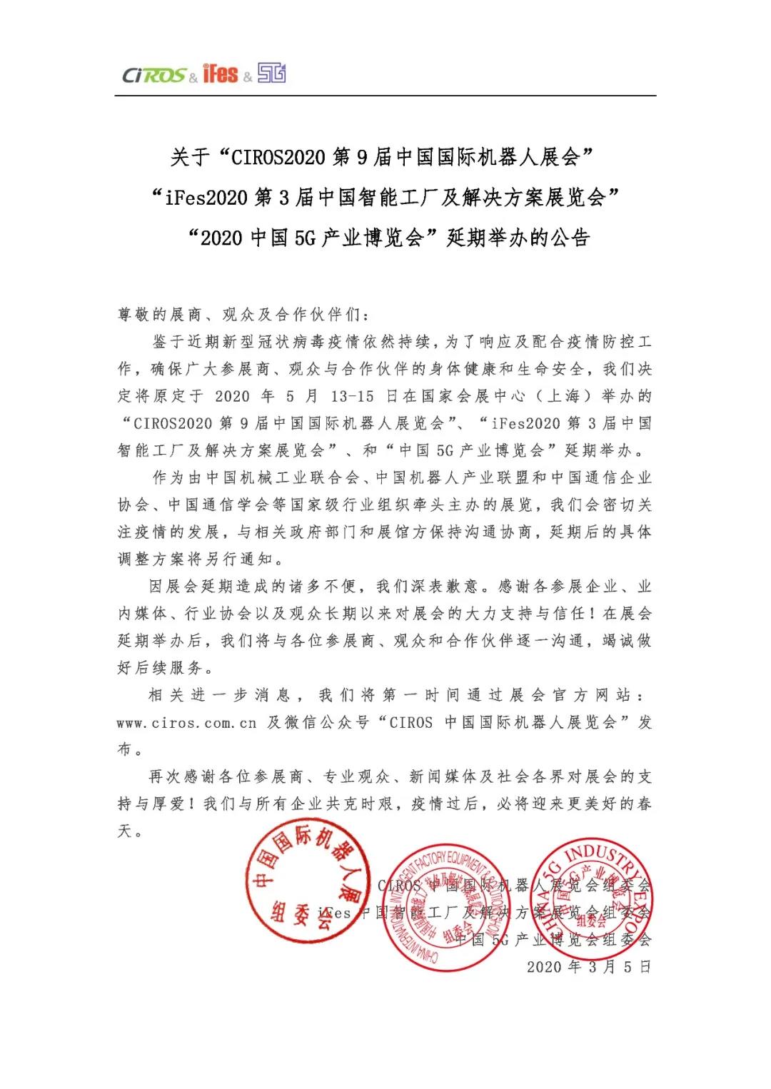 根據(jù)上海展臺設(shè)計(jì)搭建公司領(lǐng)藝展覽了解到原定于2020年5月13-15日在國家會展中心(上海)舉辦的“CIROS2020第9屆中國國際機(jī)器人展覽會”、“iFes2020第3屆中國智能工廠及解決方案展覽會”和“中國5G產(chǎn)業(yè)博覽會”延期舉辦。如需上海展臺設(shè)計(jì)請聯(lián)系領(lǐng)藝展覽,希望我們能在上海展臺搭建上為您添磚加瓦,祝各位朋友收獲多多,滿載而歸!