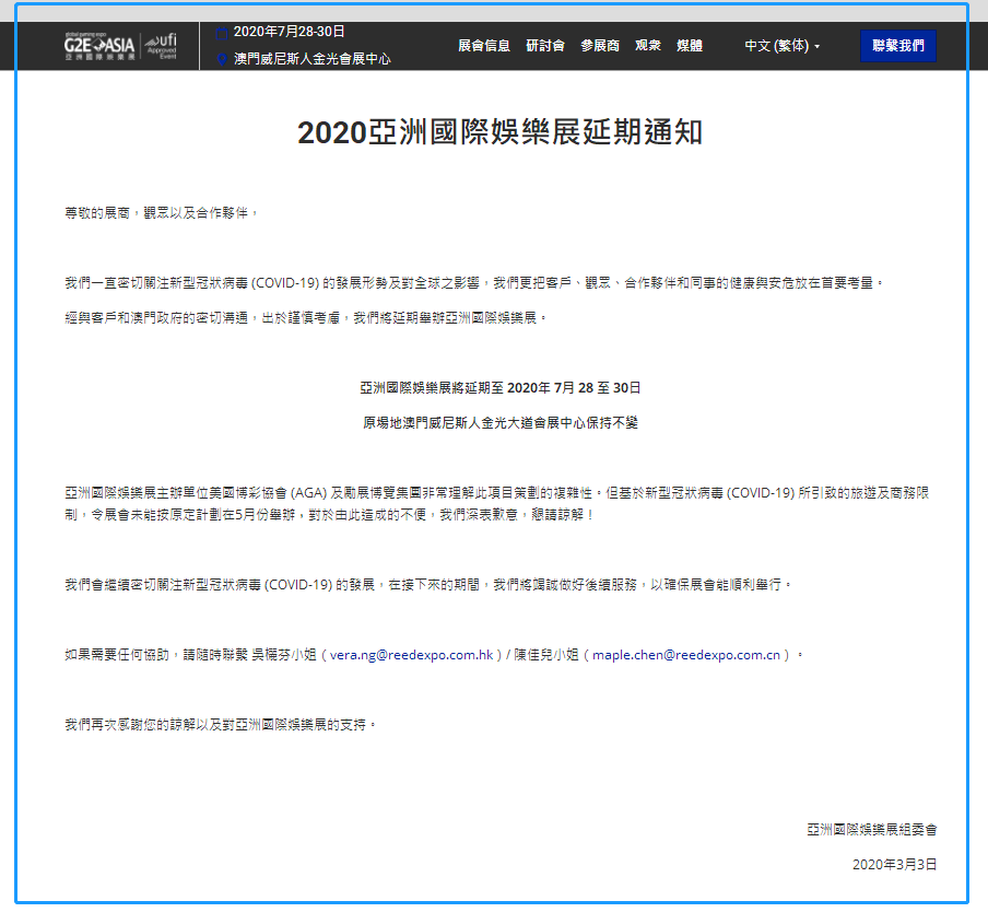 根據(jù)娛樂展設(shè)計(jì)搭建公司領(lǐng)藝展覽了解到,受新冠肺炎疫情的影響。亞洲國(guó)際娛樂展將延期至 2020年 7月 28 至 30日,原場(chǎng)地澳門威尼斯人金光大道會(huì)展中心保持不變。如需娛樂展設(shè)計(jì)請(qǐng)聯(lián)系領(lǐng)藝展覽,希望我們能在澳門展臺(tái)展搭建上為您添磚加瓦,祝各位朋友收獲多多,滿載而歸!