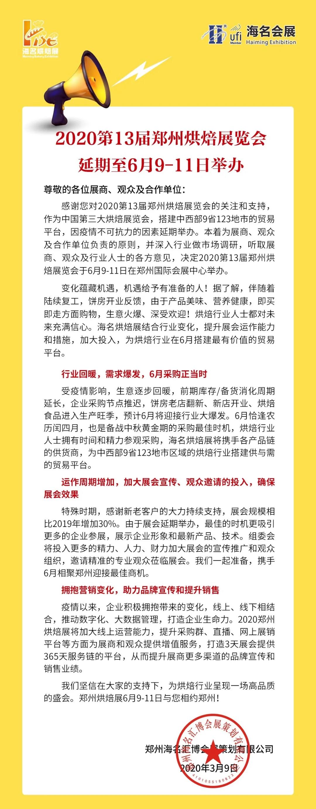 根據(jù)烘培展展臺設(shè)計搭建公司領(lǐng)藝展覽了解到,2020第13屆鄭州烘焙展覽會延期至6月9-11日舉辦。如需烘焙展展臺設(shè)計請聯(lián)系領(lǐng)藝展覽,希望我們能在烘焙展展臺搭建上為您添磚加瓦,祝各位朋友收獲多多,滿載而歸!
