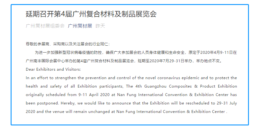 根據(jù)廣州復(fù)材展展臺設(shè)計搭建公司領(lǐng)藝展覽了解到,原定于2020年4月9-11日在廣州南豐國際會展中心舉辦的第4屆廣州復(fù)合材料及制品展覽會,延期至2020年7月29-31日舉辦,舉辦地點不變。如需廣州復(fù)材展展臺設(shè)計請聯(lián)系領(lǐng)藝展覽,希望我們能在廣州復(fù)材展展臺搭建上為您添磚加瓦,祝各位朋友收獲多多,滿載而歸!