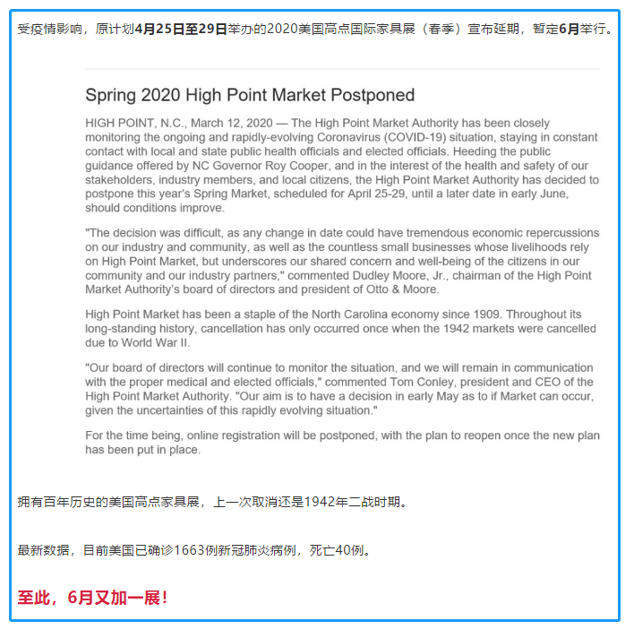 根據(jù)家具展設(shè)計搭建公司領(lǐng)藝展覽了解到,受疫情影響,原計劃4月25日至29日舉辦的2020美國高點國際家具展(春季)宣布延期,暫定6月舉行。如需家具展設(shè)計請聯(lián)系領(lǐng)藝展覽,希望我們能在家具展搭建上為您添磚加瓦,祝各位朋友收獲多多,滿載而歸!