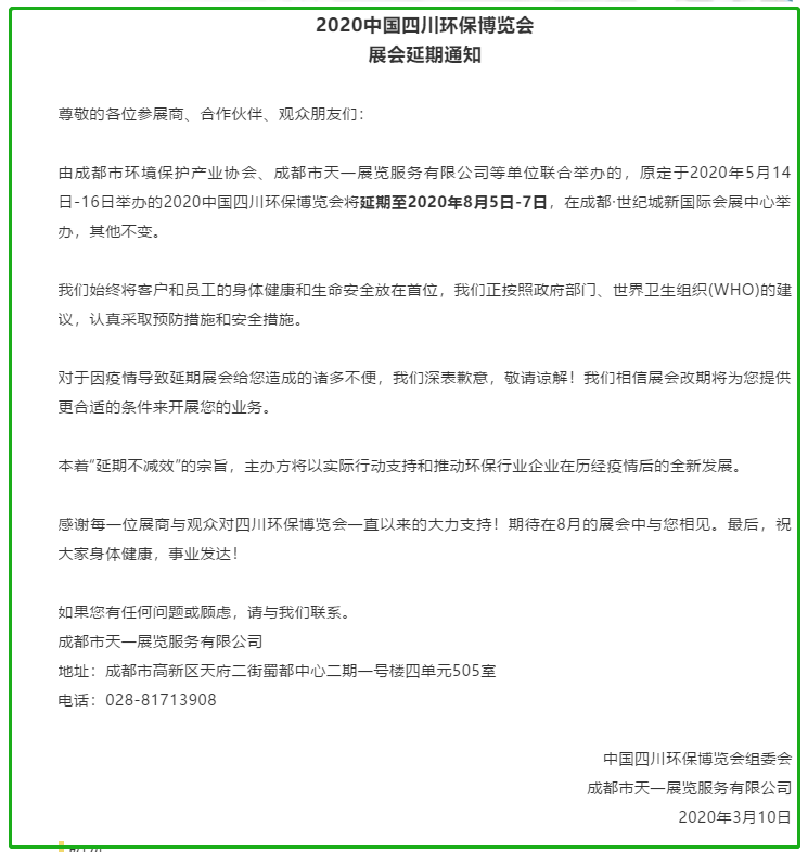 根據(jù)環(huán)保展設(shè)計(jì)搭建公司領(lǐng)藝展覽了解到,原定于2020年5月14日-16日舉辦的2020中國(guó)四川環(huán)保博覽會(huì)將延期至2020年8月5日-7日,在成都·世紀(jì)城新國(guó)際會(huì)展中心舉辦,其他不變。 如需環(huán)保展設(shè)計(jì)請(qǐng)聯(lián)系領(lǐng)藝展覽,希望我們能在環(huán)保展搭建上為您添磚加瓦,祝各位朋友收獲多多,滿載而歸!